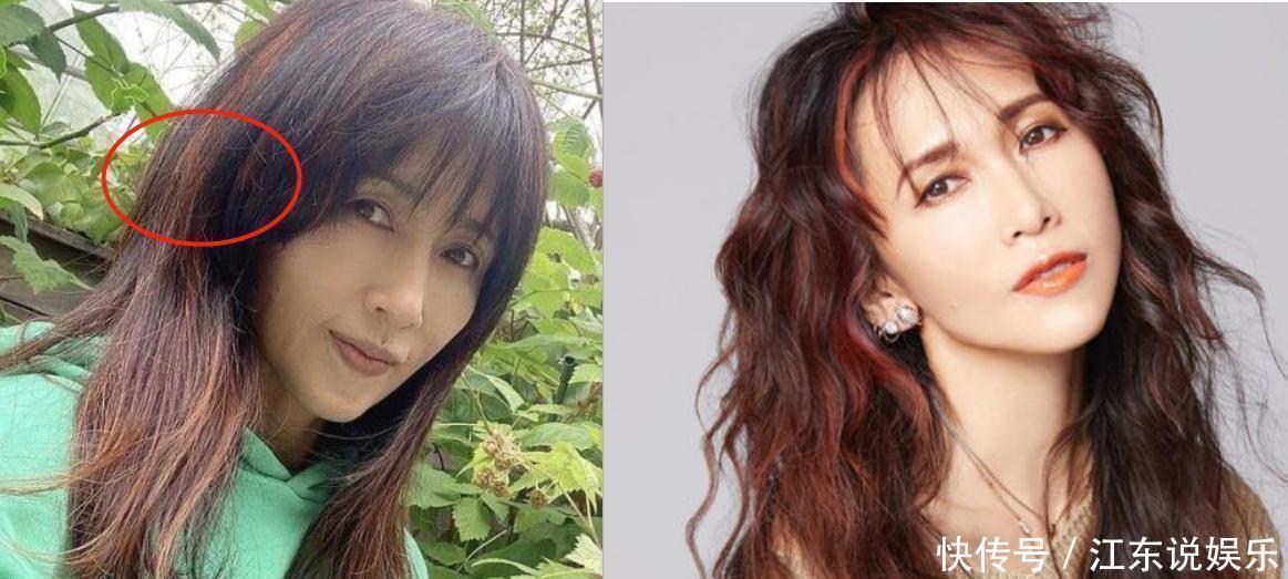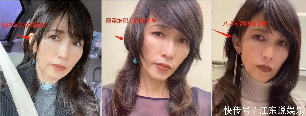 以工藤静香为例,她原本是瓜子脸,可惜脸上没有太多肉,颧骨还挺突出,中庭外扩的感觉就让人看起来又老又凶。把一些头发遮在两颊上,能让脸部线条看起来更柔和一些;或者一边留厚一些,压到耳后,也能达到不错的修饰效果。