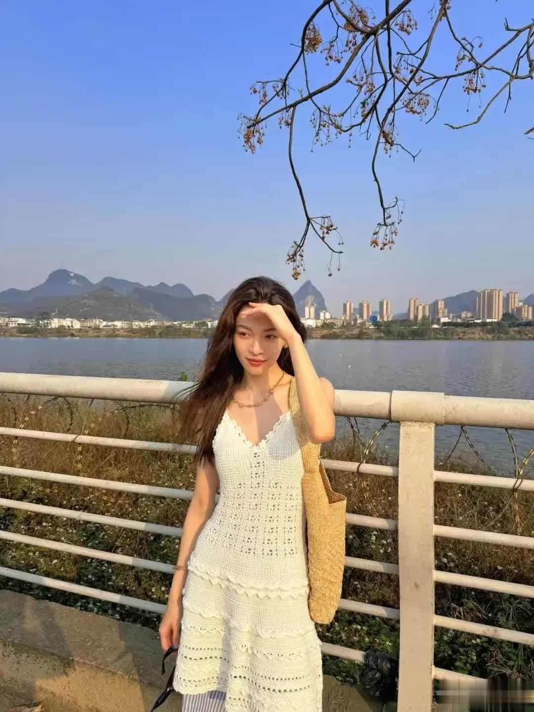 干净素雅的棉质白裙,看似简单实则暗藏玄机,针织钩花的面料,自带一种优雅精致感。吊带深V的设计,可以突出她的颈部线条和优美的直角肩,将她整个人显得更加修长优雅,扩大的裙摆,增添一丝优雅与柔和,使得整体造型既有女人味,又能轻松打造优雅气质。