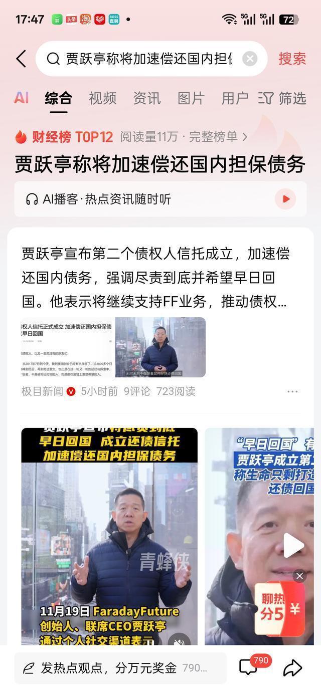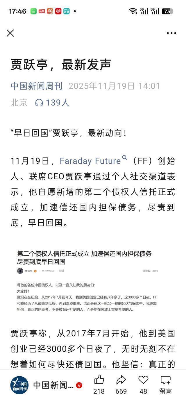 有网友调侃:“贾跃亭的FF汽车,比我的年终奖还让人期待,可我的年终奖至少每年能盼一次,他的车,盼了十年还没盼到。”贾跃亭称,从2017年7月开始,他到美国创业已经3000多个日夜了,无时无刻不在想着如何尽快还债回国。 他坚信:真正的创业者,不是被命运打倒的人,而是能在废墟上重塑希望的人。贾跃亭回顾了2017年乐视债务危机爆发以及自己承担巨额债务的情况。贾跃亭强调,“还债不仅是法律责任,更是一份道义和信念。无论身在何处,我每天都在为早日还清债务、重归祖国而努力。只要能推动这一目标的实现,我都会全力以赴。” 这些年,贾跃亭没少被骂“老赖”,可奇怪的是,他也没逃避,反而一次次站出来承诺:“一定会还清债务,一定会回国。”这种“不跑路、不赖账”的态度,倒让不少人对他多了点“复杂的好感”。就像邻居家那个总说“下个月还钱”的叔叔,虽然每次都拖,但每次见面都会主动提一句“钱的事别急”,久而久之,大家虽然不会真“不急”,却也不会再骂他“没良心”——毕竟,比起那些拿了钱就跑路的人,他这份“坦诚”,也算是一种“暖意”。就像他自己说的:“还债不仅是法律责任,更是一份道义和信念。”这话听着,比FF91的宣传语还真诚,让人忍不住想信他一次,哪怕已经信了十年。 其实,“下周回国”这个梗,早就成了互联网上的“经典段子”。有人把它做成了表情包,有人把它写进了段子,甚至有人把它当成了“年度flag”——每到年底,就有人在评论区问:“贾跃亭,下周回国吗?”这调侃里,有对他“言而无信”的调侃,也有对他“不放弃”的暖意。就像我们调侃自己“下周一定减肥”“下周一定早睡”,调侃完了,该减肥的还是没减肥,该熬夜的还是在熬夜,可调侃本身,已经成了生活里的一种“小确幸”——哪怕目标没实现,调侃的过程,也让我们多了一点“笑对生活”的勇气。 贾跃亭的传奇,从来不是因为他造出了多少牛的车,或者赚了多少钱,而是因为他像极了我们每个人:有梦想,会犯错,会拖延,会说“下周”,然后一拖再拖。他画过大饼,也栽过跟头;有过辉煌,也有过落魄;有老婆陪着,也有债主追着。可他没放弃,哪怕FF再不给力,哪怕债务再沉重,他还是在努力——把AIXC股份的50%放进信托还债,继续推动FFAI的发展,哪怕这些努力,在外界看来,像极了“用勺子舀干大海”,可他还在舀。 或许,“下周回国”从来就不是一个具体的时间,而是一种“我还在努力,我一定会回去”的信念。就像我们每次说“下次一定”,虽然可能没有“下次”,可说的时候,是真的想做到。贾跃亭的“下周”,或许就是他对自己、对债主、对老婆的承诺——哪怕路再难,债再重,他还是会朝着“回国”的方向走,哪怕这“下周”,已经续了十年。 所以啊,下次再看到“贾跃亭下周回国”的调侃,别光顾着笑,也别光顾着骂。想想他那些年的激情,想想他老婆的坚守,想想他面对债务时的坦诚,或许就能多一点理解,少一点苛责。毕竟,人生就像一场马拉松,“下周回国”只是贾跃亭的“补给站”,哪怕他跑得慢,哪怕他停下来调整了十年,只要他还在跑,就还有“冲线”的可能。