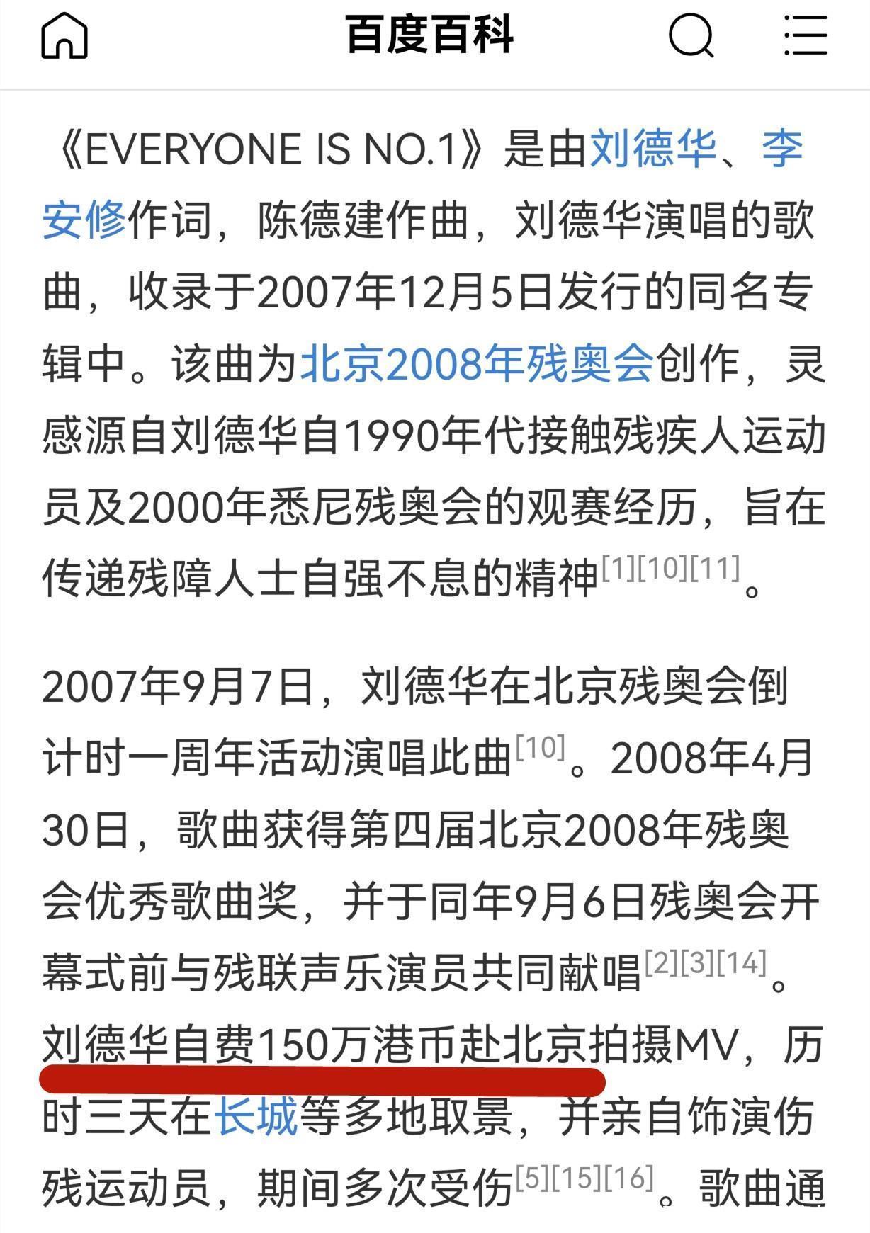 所以2007年,刘德华创作残奥歌曲《《EVERYONE IS NO.1》》,并且自掏腰包150万港币拍摄MV