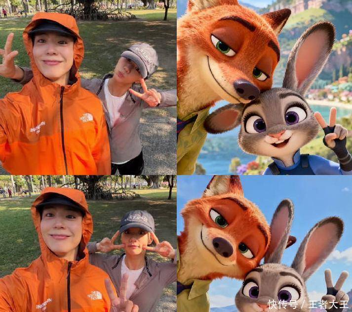 照片里俩人穿着休闲运动服,朴宝剑那蓝色的卫衣配李惠利的粉色裤子,网友们立马脑补成《疯狂动物城》里的朱迪和尼克。